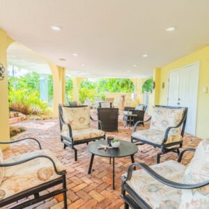 Step into your own private sanctuary surrounded by vibrant landscaping and swaying palms. The emerald-green swimming pool glistens under the sun — the centerpiece of this peaceful backyard oasis. Relax poolside on lounge chairs, grill up a fresh catch, or sip a drink under the shade of the covered patio area.